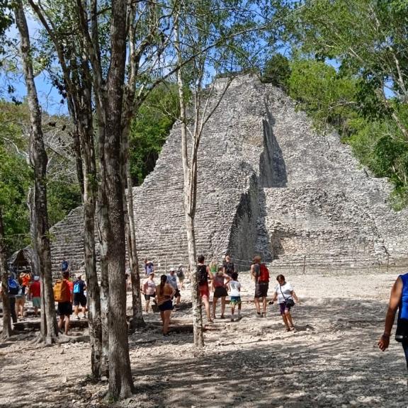 You’ll enjoy a delicious buffet of regional dishes and continue your tour of the CobĂĄ archaeological zone with a certified guide, where you’ll find the majestic 42-meter-high Nohoch Mul pyramid. You’ll then have free time to stroll around.